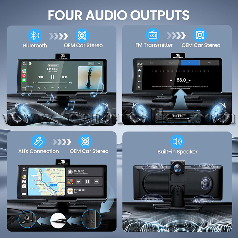 Salida de Audio Estable y de Alta Calidad: Equipada con tecnología Bluetooth avanzada, esta pantalla inalámbrica de carplay con cámara de tablero te permite transmitir audio de forma inalámbrica a los altavoces estéreo de tu automóvil para una experiencia musical sin pérdidas. (También se puede conectar a través de Bluetooth, FM o AUX) Además, la pantalla cuenta con altavoces integrados de alta calidad para un sonido excepcional.