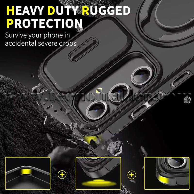 Soporte magnético giratorio de 360° para manos libres. Protector deslizante para la cámara integrado para mayor seguridad de la lente. La compatibilidad con MagSafe garantiza una carga inalámbrica (con teléfonos capaces) y el uso de accesorios sin problemas. Construcción híbrida de PC resistente y TPU flexible para una protección superior. Recortes precisos para facilitar el acceso a botones, puertos y funciones.