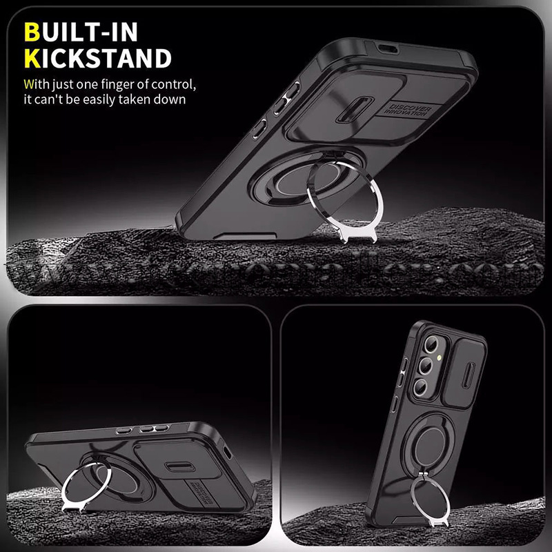 Protege tu teléfono con esta funda híbrida premium con soporte magnético giratorio de 360° y protector deslizante para la cámara. Diseñada para MagSafe, esta funda permite la carga inalámbrica y el uso de accesorios sin esfuerzo. Su resistente construcción híbrida de PC y TPU ofrece una excelente resistencia a los golpes, a la vez que mantiene un perfil delgado y ligero. Los recortes precisos brindan un acceso perfecto a todas las funciones del teléfono, lo que la convierte en la opción perfecta para estilo y protección.