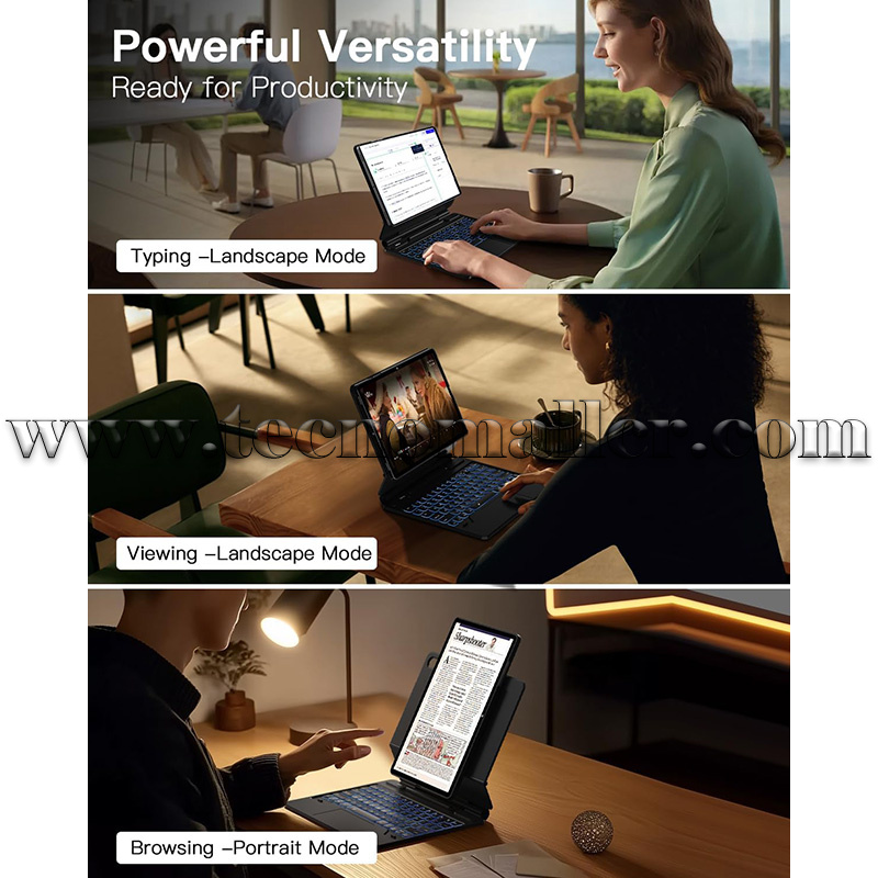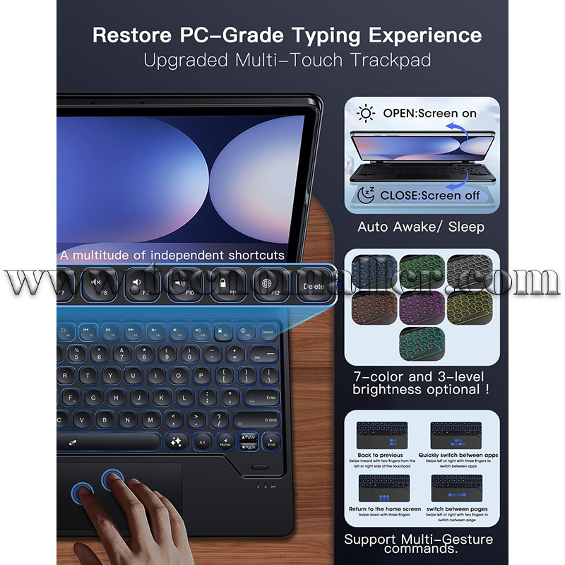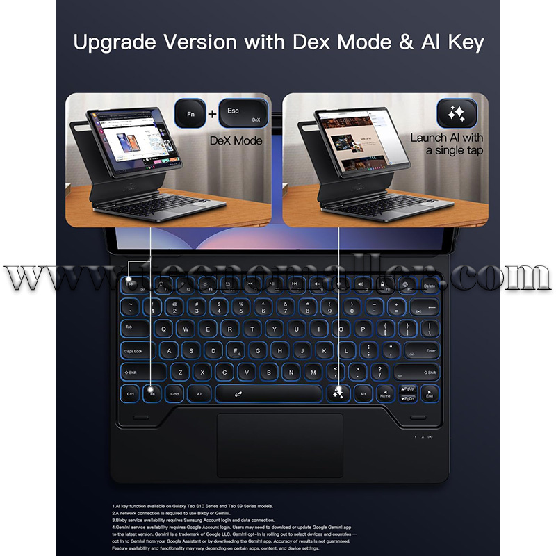 Para el modo Samsung DEX/tablet: Exclusivamente emparejado con el modo DeX, tu tablet Samsung se transforma en un portátil, perfecto para aumentar la productividad. Cambia los modos y escribe fácilmente. Nuestras teclas de interruptor de tijera proporcionan una escritura silenciosa y sensible. Una fila de prácticos teclas de acceso directo está diseñada en el teclado, que puede ajustar el brillo de la retroiluminación, control de volumen, conmutación multimedia, etc.