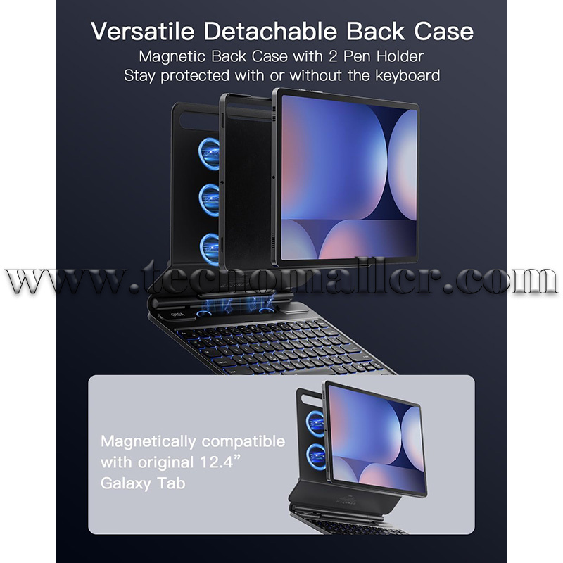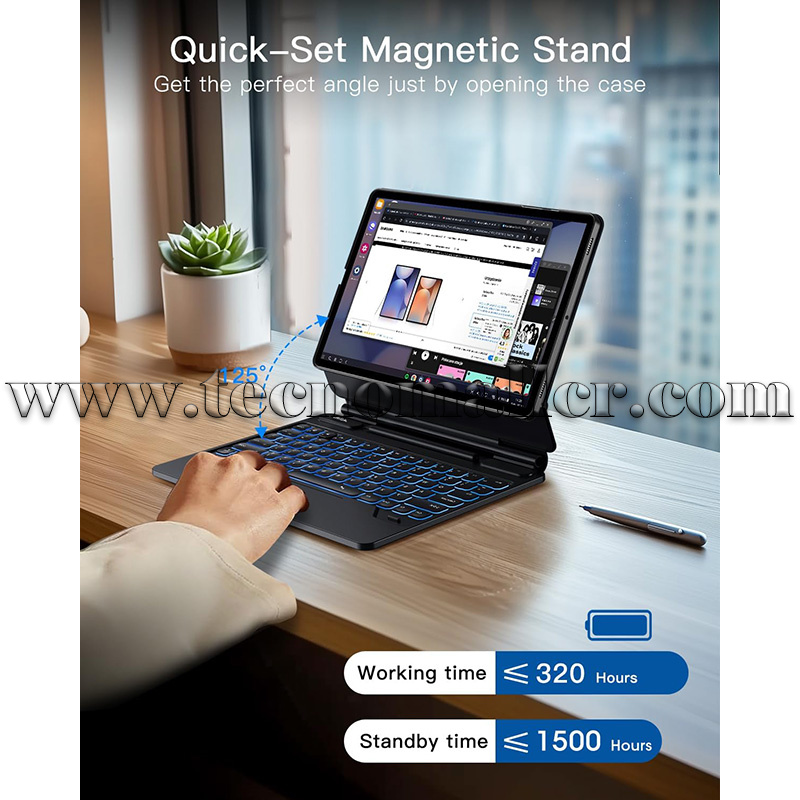 Soporte magnético de voladizo flotante ultra fuerte: simplemente conecta tu tablet magnéticamente y comienza a escribir. Puede convertir tu Samsung Tab S10 Plus/S9 FE+/S9 Plus/S8 Plus/S7 FE en un portátil al instante. Las bisagras de aleación de aluminio duraderas garantizan la estabilidad del soporte. Esta funda para teclado tiene un diseño flotante en voladizo. Se ajusta suavemente al ángulo de visión perfecto. Hecho a medida para escribir, leer y una experiencia de visualización inmersiva. Perfecto para viajes, negocios y trabajo.