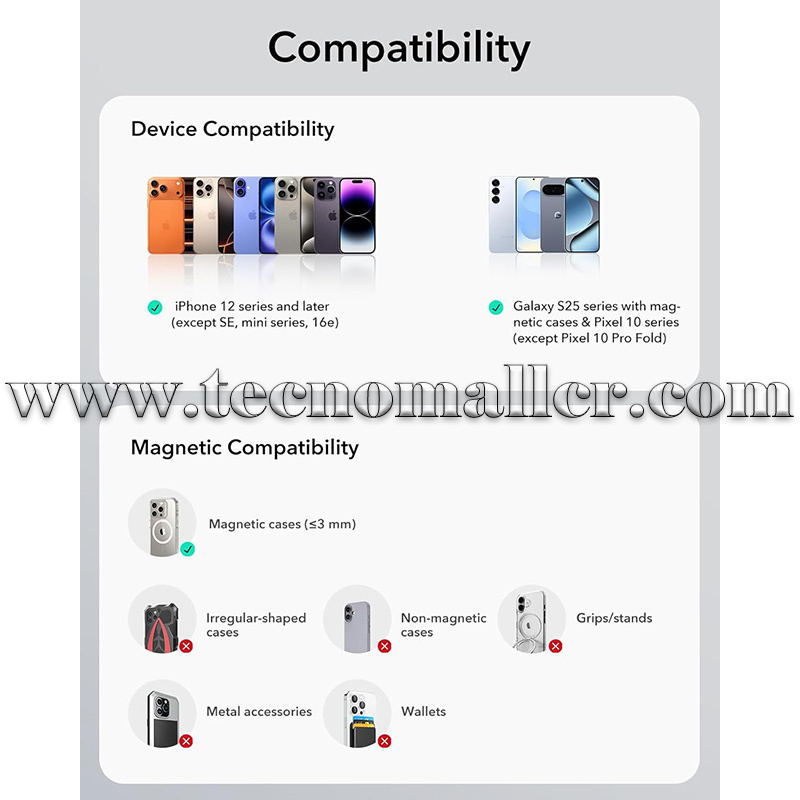 Para una carga óptima, utiliza el cable proporcionado para conectar a un cable de carga USB-C a C con una salida de potencia ≥ 20 W; recomendado para usar con fundas magnéticas oficiales o ESR Compatibilidad: solo para iPhone 17/16/15/14/13/12 series, Samsung Galaxy S25 Ultra/S25 +/S25 con una funda magnética, serie Google Pixel 10. No compatible con Motorola, OnePlus y otros teléfonos de Google