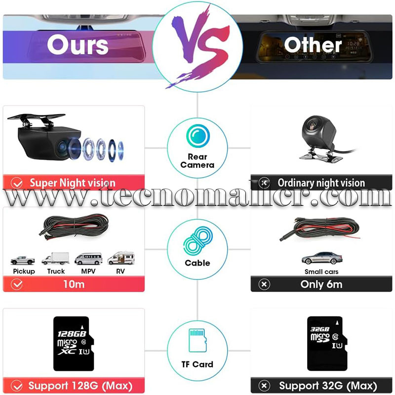 Cable dual de cámara de 1080P + 6 metros de largo: Actualiza tanto la cámara de respaldo de 1080P como el cable largo de la cámara, nuestro exclusivo cable de cámara trasera de 6 metros te ayuda a resolver el problema del cable de la cámara corta cuando la instalación. Tanto la cámara frontal 1080P como la cámara de visión trasera de 1080P proporcionan una gran calidad de video y capturan cada detalle, ya no te preocupes por no ver claramente otras matrículas. La transmisión en tiempo real de imágenes, vista a pantalla completa, la cámara de tablero de espejo con lente gran angular frontal de 170° y trasera de 140° elimina los puntos ciegos.