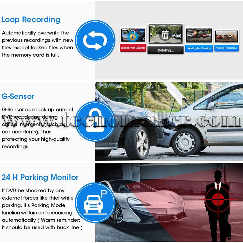 Monitor de estacionamiento 24 horas: la grabación en bucle permite sobrescribir los archivos más antiguos para garantizar una grabación continua cuando la tarjeta de memoria se llena. El sensor G detecta una colisión repentina y bloquea el metraje de colisión. El monitor de estacionamiento permite que la cámara frontal y trasera de la cámara del tablero comiencen a grabar un video bloqueado durante unos 20 segundos una vez que se encuentra con una colisión durante el estacionamiento. Se necesita un kit de cableado ACC adicional para esta función.