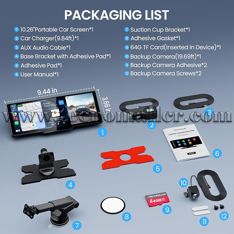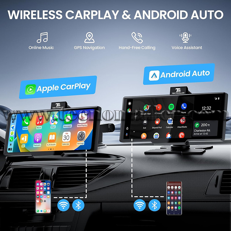 Carplay inalámbrico y Android Auto: La pantalla inalámbrica carplay TECXERLLON 2025 es compatible tanto con CarPlay como con Android Auto. Después de la configuración inicial, simplemente ingrese a su automóvil y su teléfono inteligente se conectará automáticamente a través de Bluetooth. El chip actualizado del dispositivo garantiza tiempos de arranque más rápidos, conexiones más rápidas y un rendimiento más estable en comparación con otros productos similares en el mercado.
