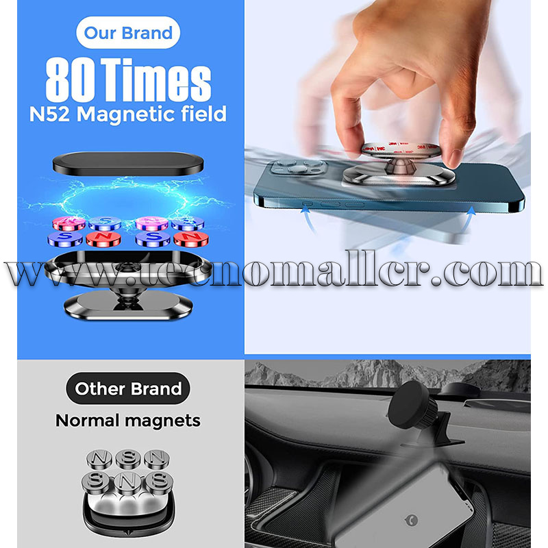 ?Potente imán mejorado: Soporte de teléfono para automóvil integrado con 8 imanes N52 de alta potencia, tamaño pequeño que a la vez proporciona un gran campo magnético. Puede sostener teléfonos grandes de forma constante, mientras tanto, el campo magnético cerrado no afectará a la señal del teléfono. Libera totalmente tus manos y mantente seguro al conducir.