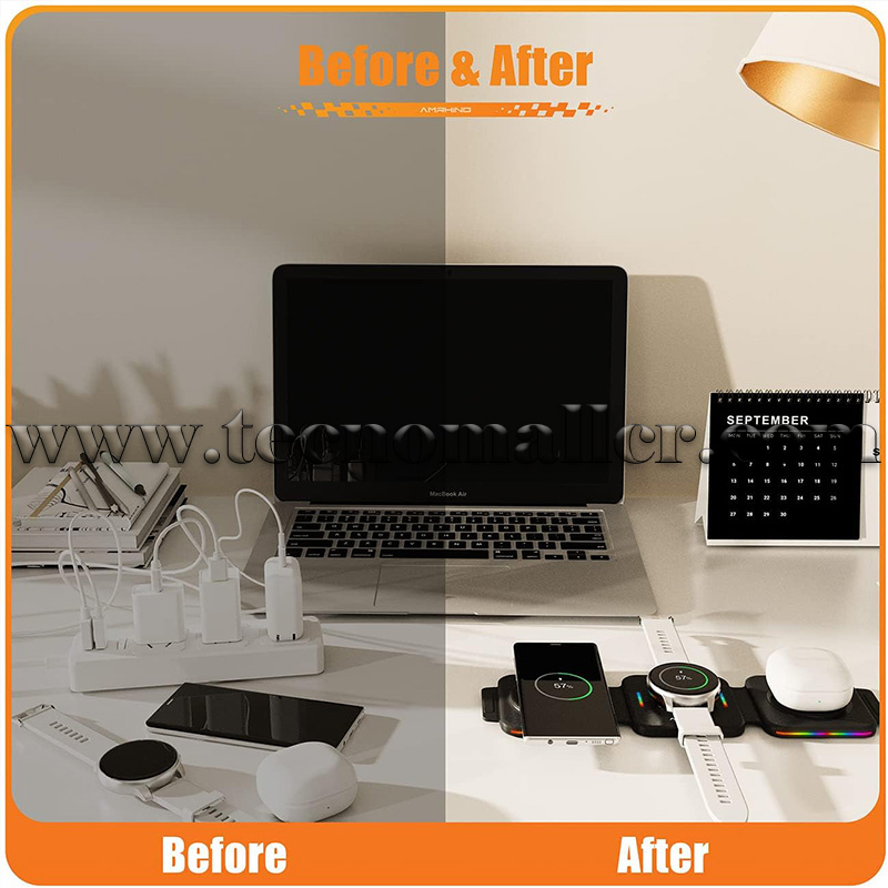 Cargador inalámbrico plegable Amrhino 3 en 1 rápido de 15 W para Celulares y Samsung Galaxy Watch y Buds