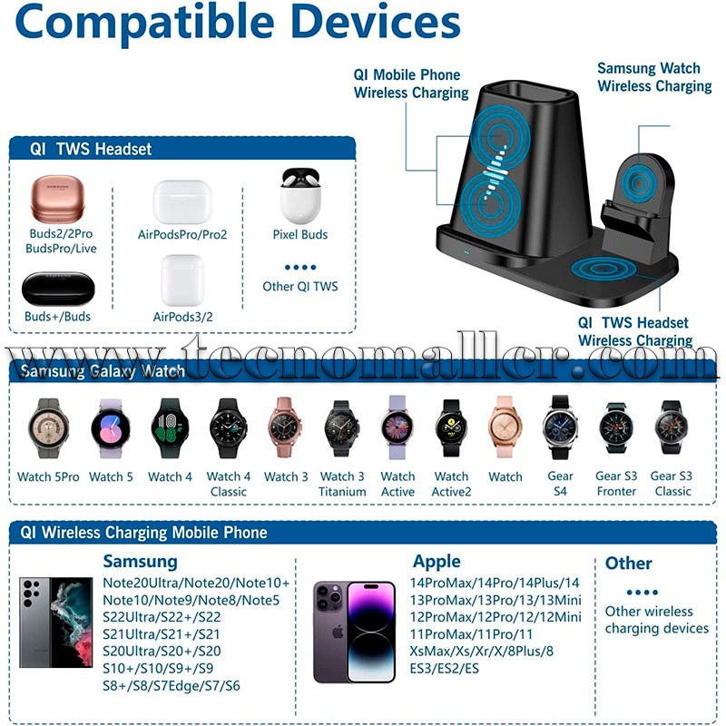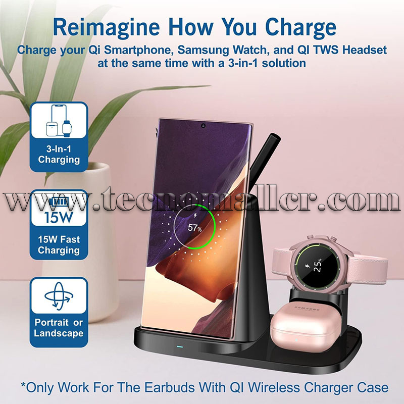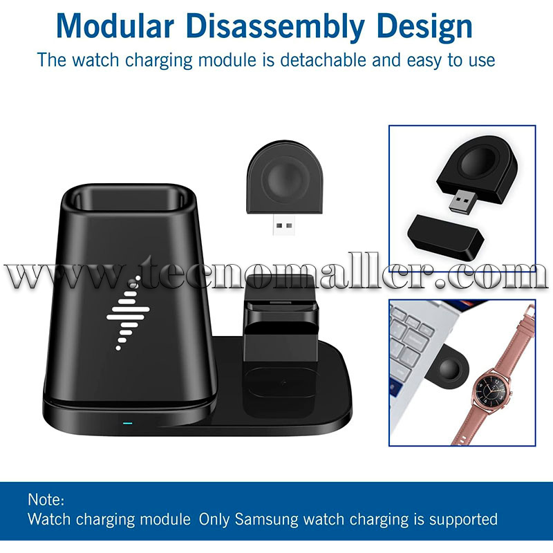 Estación de carga inalámbrica 3 en 1: para la serie Samsung puede cargar simultáneamente múltiples dispositivos, modo de carga de 15 W Compatible con Samsung Galaxy S22/S21/S20 ultra/S20 5G/S20+/S10/S10+/Note 20 Ultra 5G/Note10+/10/10e/9/S9/S8/Galaxy Z Flip ect. 7.5 W compatible con iPhone 14/13/12 Pro Max mini /11 Pro Max/XS MAX/XR/X/8 Plus. 5W para Samsung Galaxy Watch 5/5 Pro/4/3 1.614 in/1.654 in/1.772 in/1.811 in/Active 2 1.575 in/1.732 in/Gear S4/Sport, para Samsung Galaxy Buds Live/Buds+ y la mayoría de teléfonos Qi.