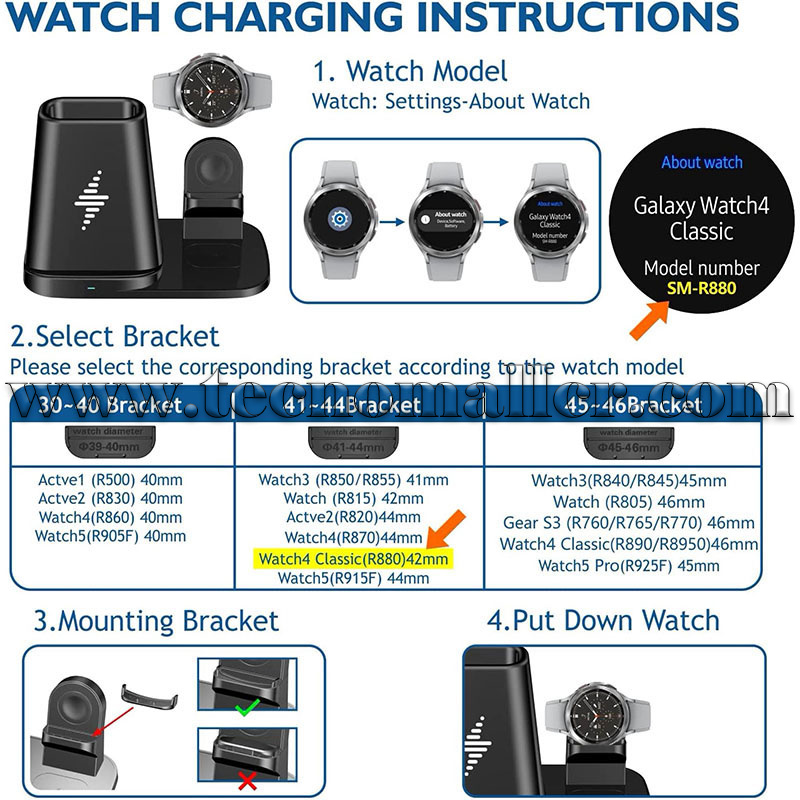 Diseño modular y eficiente conveniente: un cargador inteligente de caja de bolígrafos-Samsung galaxy watch cargador inalámbrico Diseño modular separado. Puede llevar el módulo de carga del reloj Samsung Galaxy con usted en cualquier momento Cargando su reloj Samsung Galaxy en diferentes escenas. El soporte para bolígrafo para poner el bolígrafo. Mantén tu escritorio más limpio. Utilice el reloj para cargar de acuerdo con las instrucciones. Tenemos 3 tamaños diferentes de juntas para su reloj Samsung.