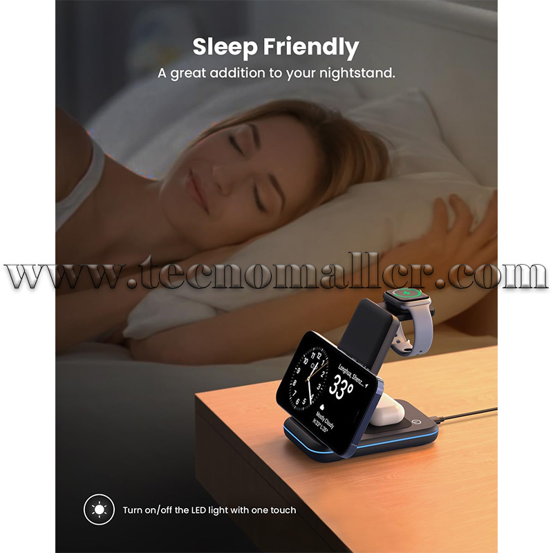 Recarga tus dispositivos, no tu sueño: el sueño es precioso, y también lo es tu tranquilidad. Nuestra estación de carga de teléfono entiende el valor de una buena noche de sueño. Es por eso que hemos añadido un botón sensible al tacto en el iPhone y la estación de carga del reloj para apagar la luz indicadora. No más distracciones molestas o luces brillantes mientras intentas descansar.