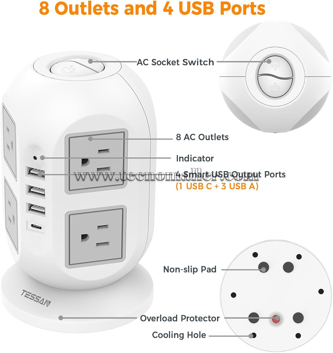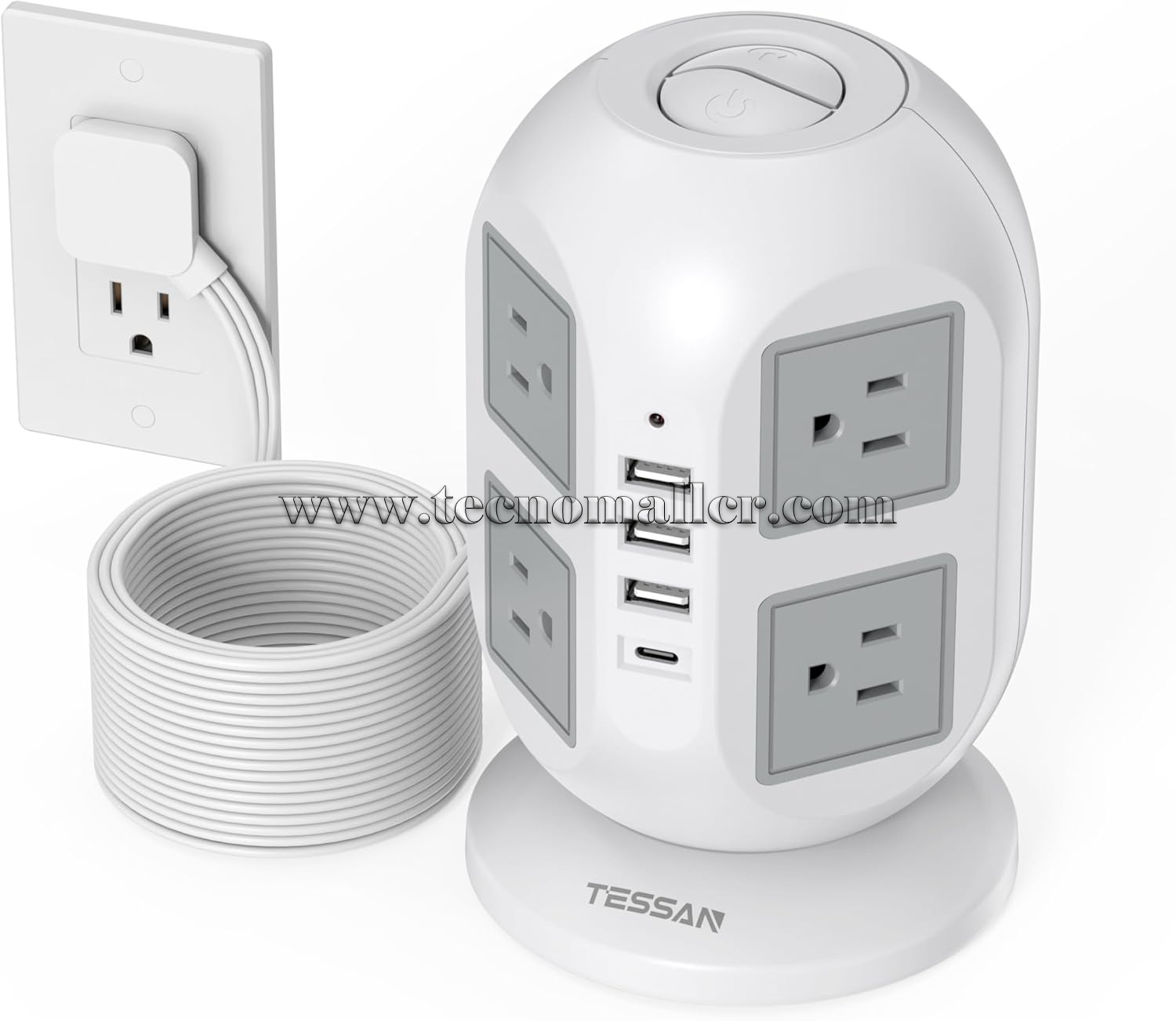 Regleta protectora contra sobretensiones Tessan JW401 con 8 CA, 3 USB-A, 1 USB-C y cable de 3m