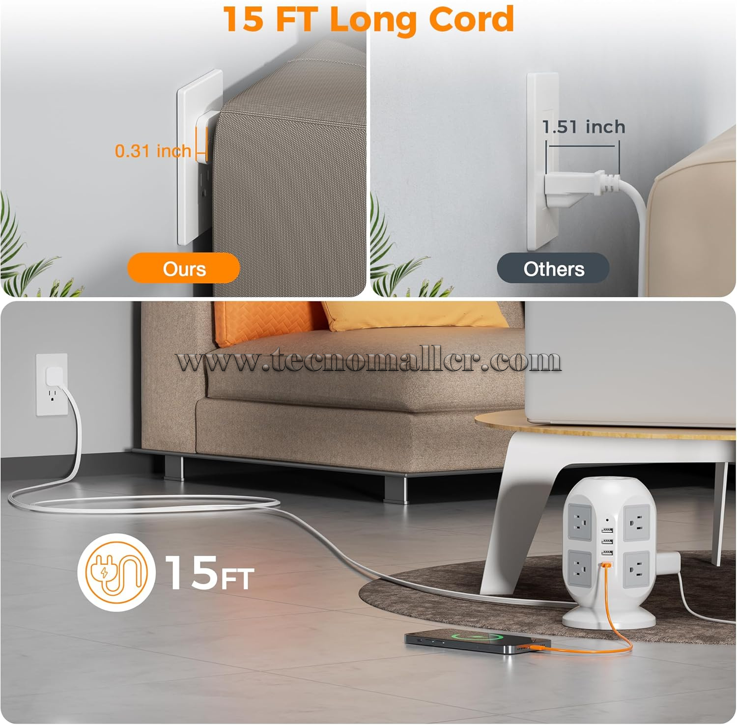 Diseño de ahorro de espacio: la regleta de alimentación de torre de diseño compacto de 4 lados ocupa poco espacio en tu escritorio, limpia varios cables y crea un espacio limpio y ordenado; base estable con 4 pies de goma en la parte inferior, evita que este cable de extensión se deslice y se deslice de manera eficiente a 3 metros