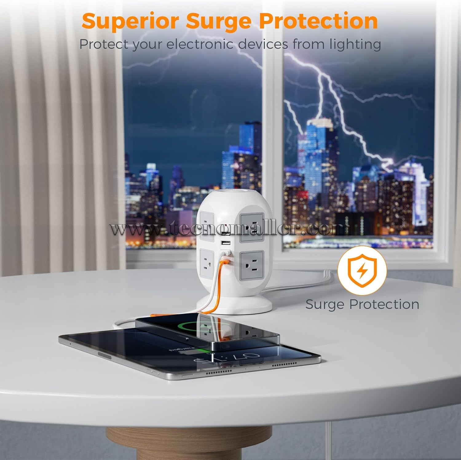 Torre de protección contra sobretensiones: equipada con protección contra sobrecarga, protección contra cortocircuitos, protección contra sobrecorriente, etc. El interruptor de encendido/apagado confiable puede apagar automáticamente y proteger sus costosos dispositivos electrónicos, proporcionándole un entorno de carga seguro y confiable