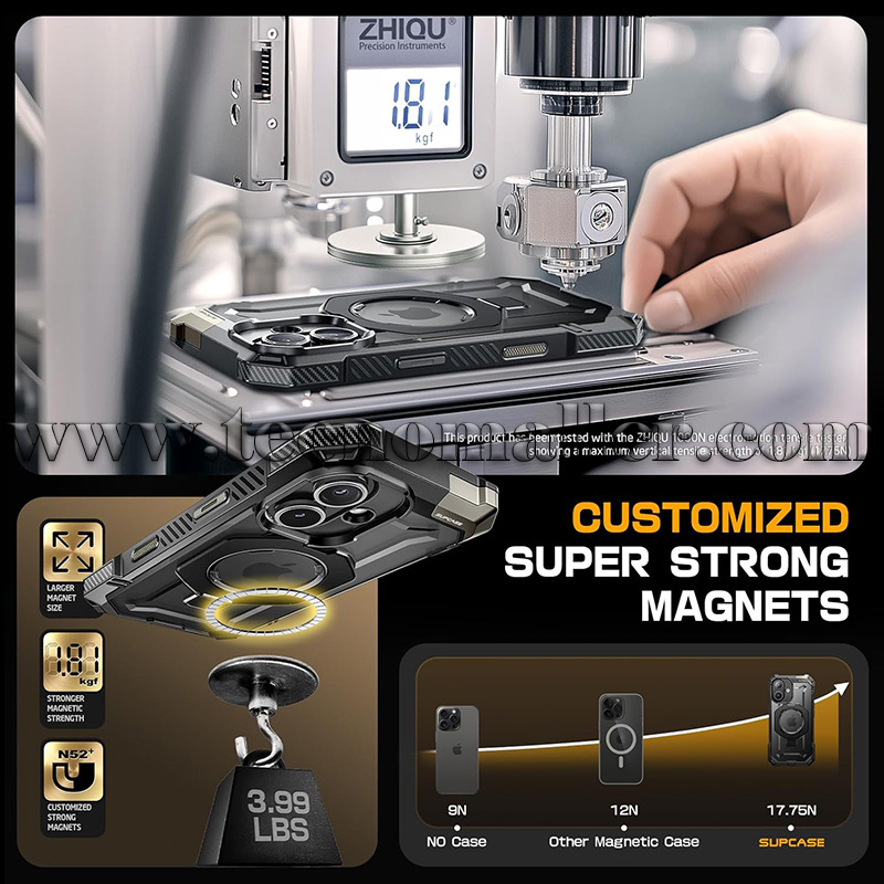 El soporte de aleación de aluminio incorporado ofrece múltiples ángulos de visión. Equipado con un potente imán N52, que ofrece una fuerza magnética de hasta 52.91 oz, lo que garantiza una compatibilidad perfecta con los accesorios MagSafe (soporte magnético para automóvil, cargador inalámbrico MagSafe, soporte para tarjeta magnética, soporte de carga inalámbrico magnético de escritorio).