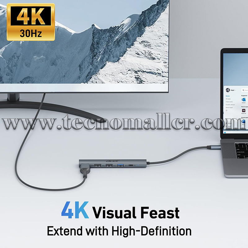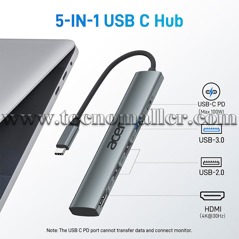 Versátil concentrador USB C 5 en 1: Eleva tu conectividad con el adaptador USB C 5 en 1 Acer, con un puerto HDMI 4K 30Hz, un puerto de carga PD de 100 W, un puerto USB 3.0 y 2 puertos USB 2.0. Perfecto para conectar y cargar múltiples dispositivos sin esfuerzo, ya sea en casa, en la oficina o en movimiento