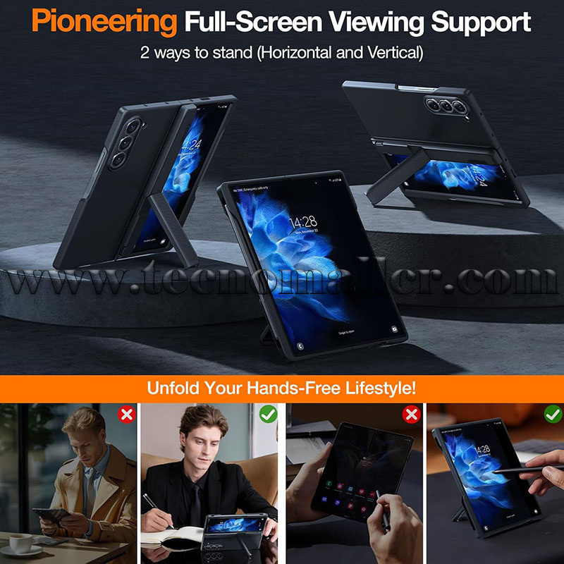 Revolucionario salto Astand: El diseño de la funda Z Fold 6 combina un soporte, imán, bisagra y más, lo que te permite utilizar el soporte, cargar tu teléfono o protegerlo en cualquier momento y en cualquier lugar, todo mientras que requiere muchos menos accesorios. La funda Z Fold 6, fabricada con un soporte integrado en la cubierta de la bisagra, apoya tu teléfono en una posición vertical u horizontal, lo que te permite disfrutar de una visualización de pantalla completa manos libres.